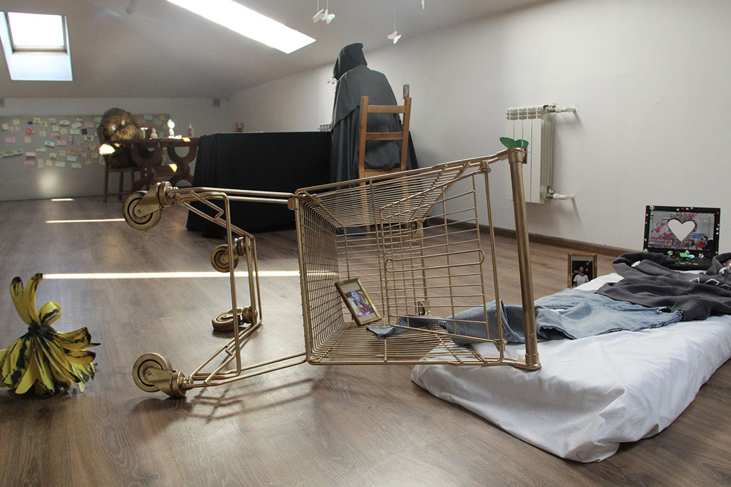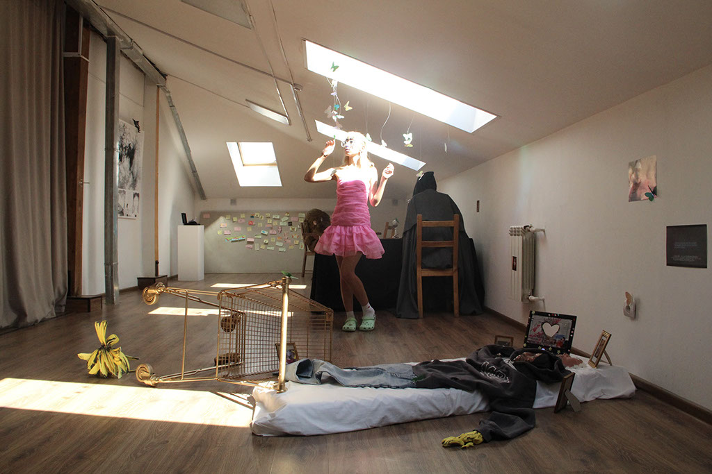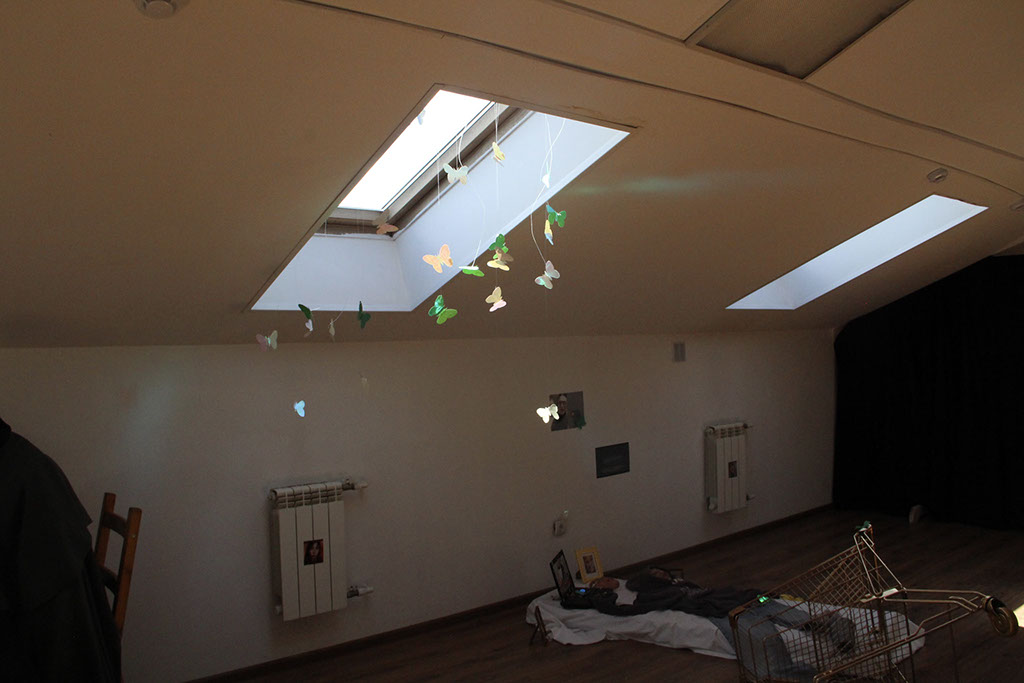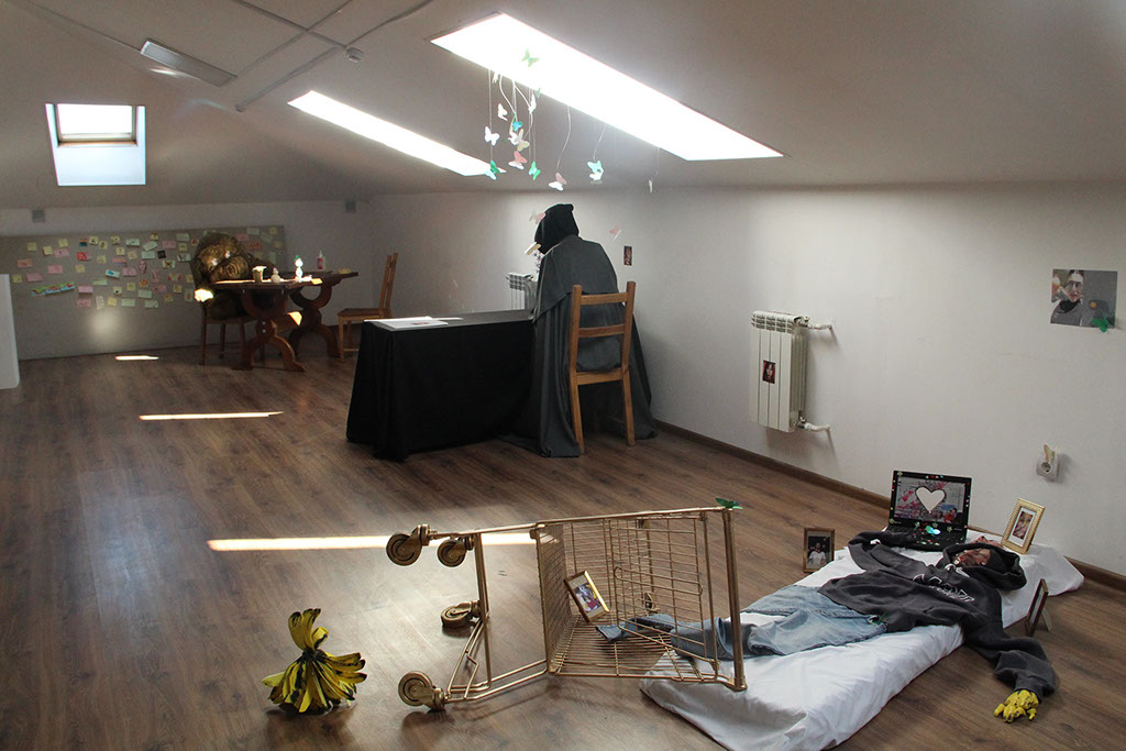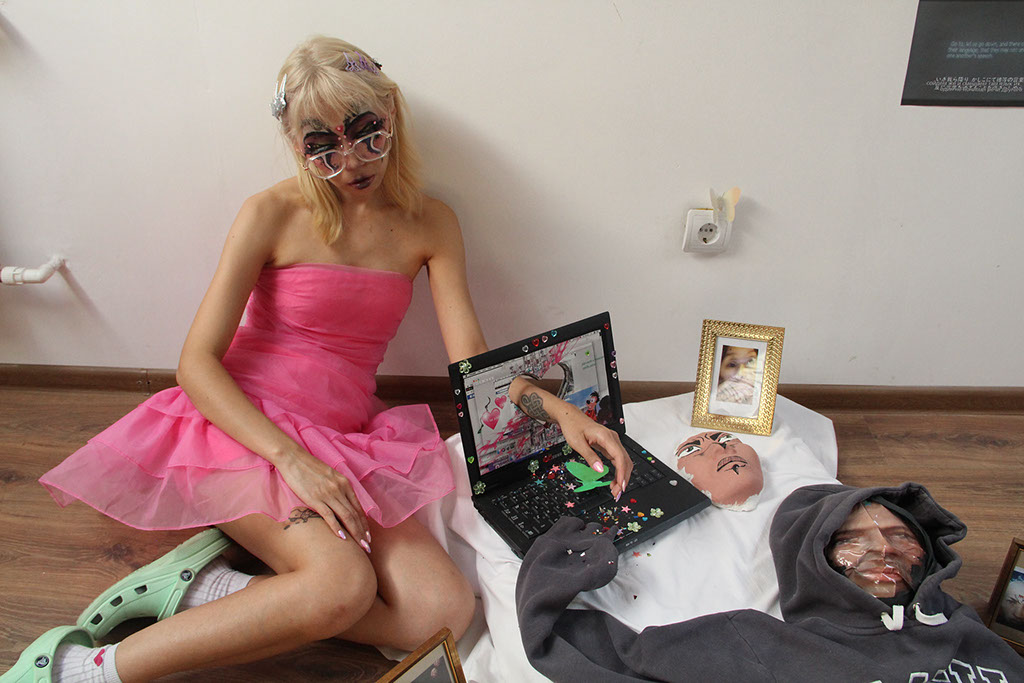 Материалы: 3D-маска А.С. Пушкина, наклеенная с искажениями на слепок лица автора; толстовка и джинсы автора; ноутбук с вырезанным сердцем на мониторе с коллажом «Рассвет в тишине среди росы» и стразы; селфи; найденные объекты; бумажные бабочки; печать; «Банановый ангел» из строительных материалов.