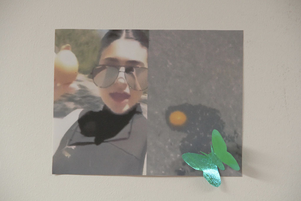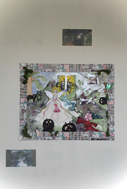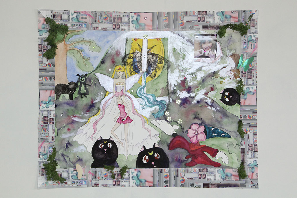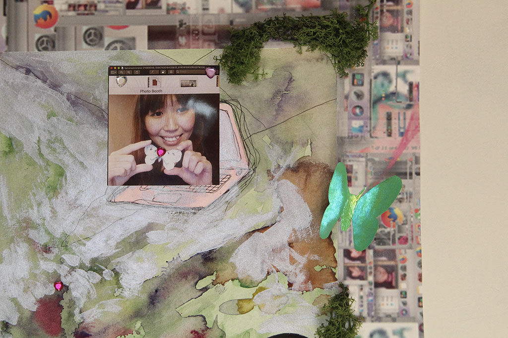 Материалы: бумага, акварель, акрил, гелевая ручка, стразы, искусственный мох, печать, селфи, фрагменты старой видеоработы, рамка из авторского коллажа, бумажная бабочка.