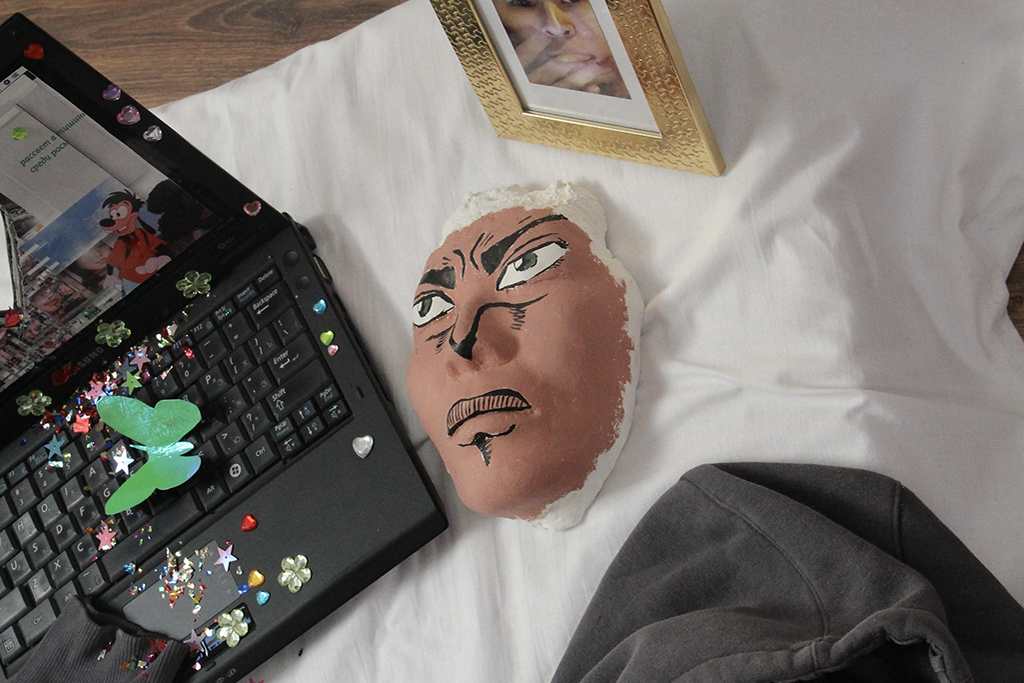 Материалы: 3D-маска А.С. Пушкина, наклеенная с искажениями на слепок лица автора; джинсы и толстовка автора; слепок лица автора, раскрашенный под Джотаро Куджо из аниме «ДжоДжо»; ноутбук с вырезанным сердцем на мониторе с коллажом «Рассвет в тишине среди росы» и стразы; селфи; найденные объекты; бумажные бабочки.