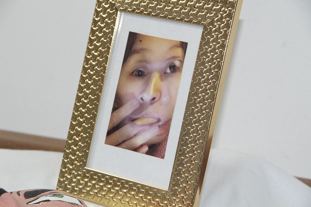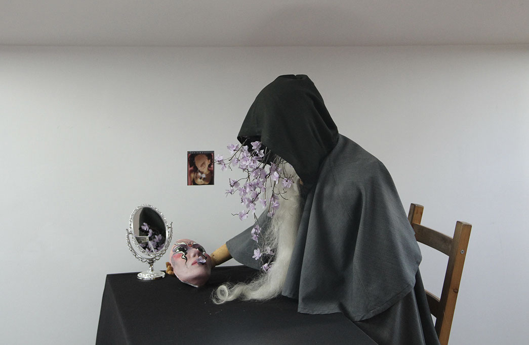 Материалы: найденные объекты, сухие ветки, бумага, авторский макияж на слепке лица автора, печать селфи.