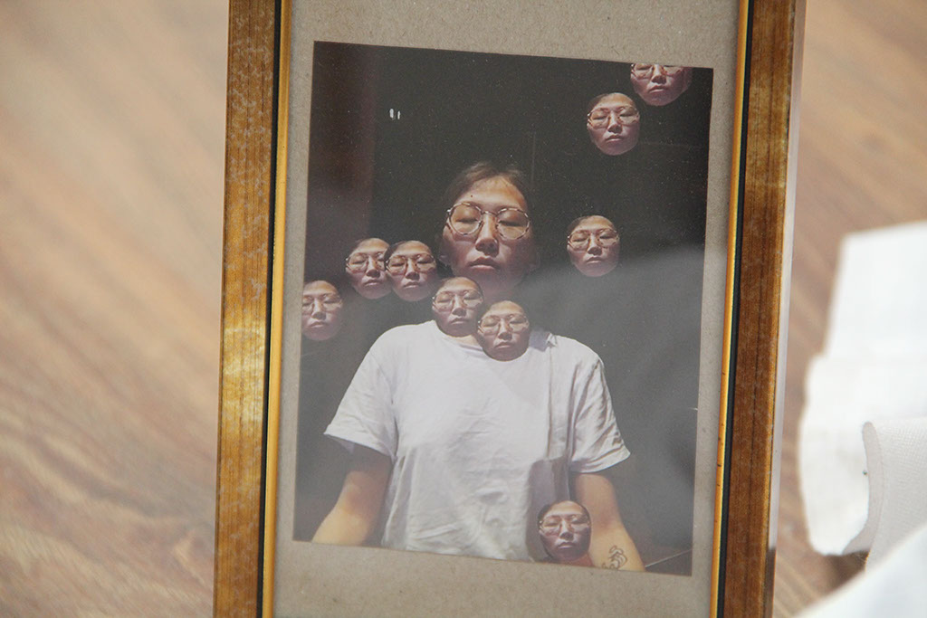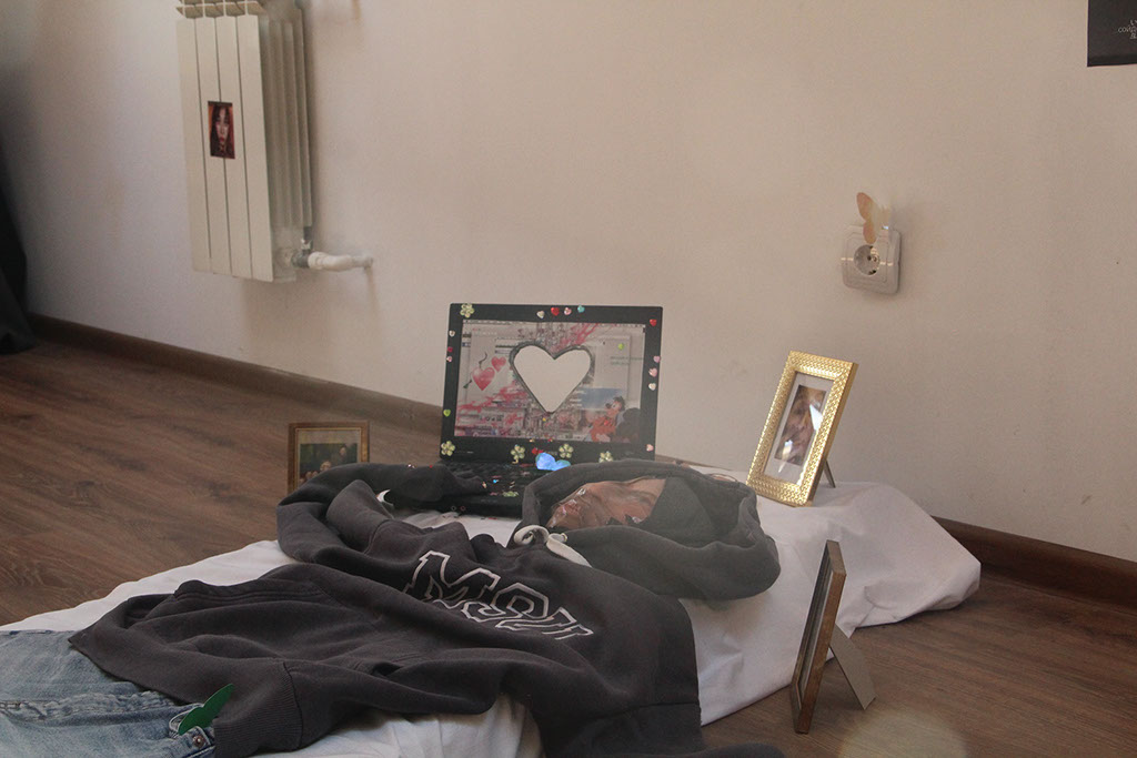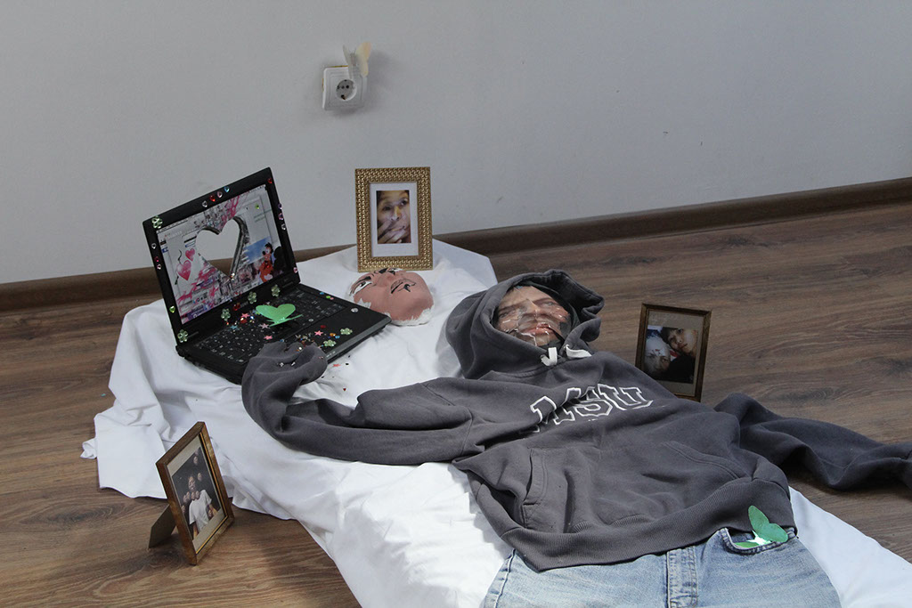 Материалы: 3D-маска А.С. Пушкина, наклеенная с искажениями на слепок лица автора; джинсы и толстовка автора; слепок лица автора, раскрашенный под Джотаро Куджо из аниме «ДжоДжо»; разбитый слепок руки автора; ноутбук с вырезанным сердцем на мониторе с коллажом «Рассвет в тишине среди росы» и стразы; селфи в рамках; селфи на батареях; найденные объекты; бумажные бабочки; печать.