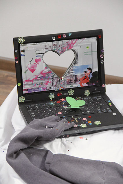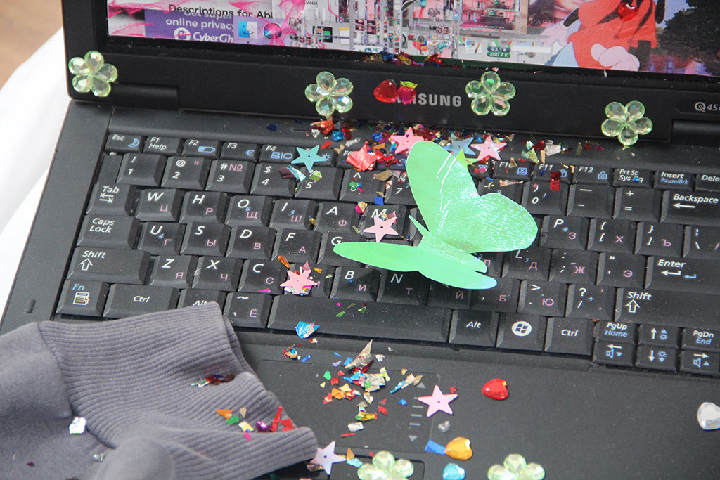 Материалы: ноутбук с вырезанным сердцем на мониторе с коллажом «Рассвет в тишине среди росы» и стразы; бумажная бабочка; конфетти; найденные объекты.