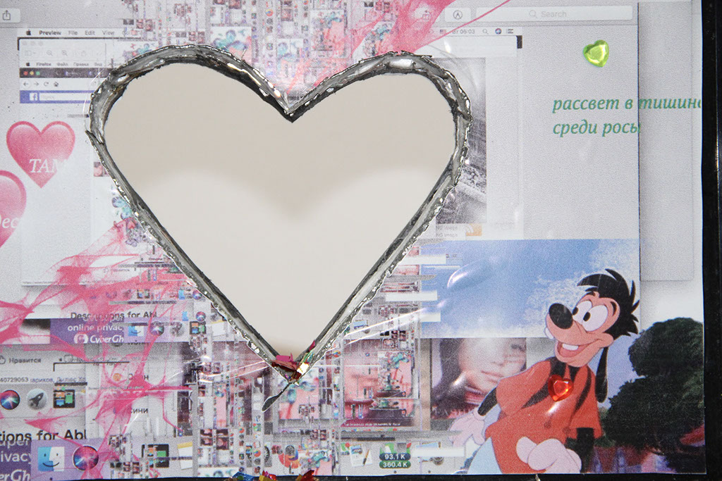 Материалы: 3D-маска А.С. Пушкина, наклеенная с искажениями на слепок лица автора; толстовка и джинсы автора; ноутбук с вырезанным сердцем на мониторе с коллажом «Рассвет в тишине среди росы» и стразы; селфи; найденные объекты; бумажные бабочки; печать.