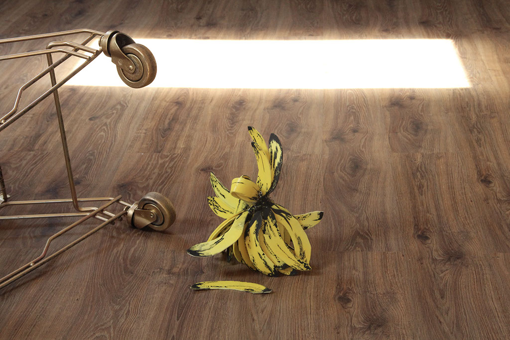 Материалы: «Банановый ангел» из строительных материалов, краска; золотая тележка.
