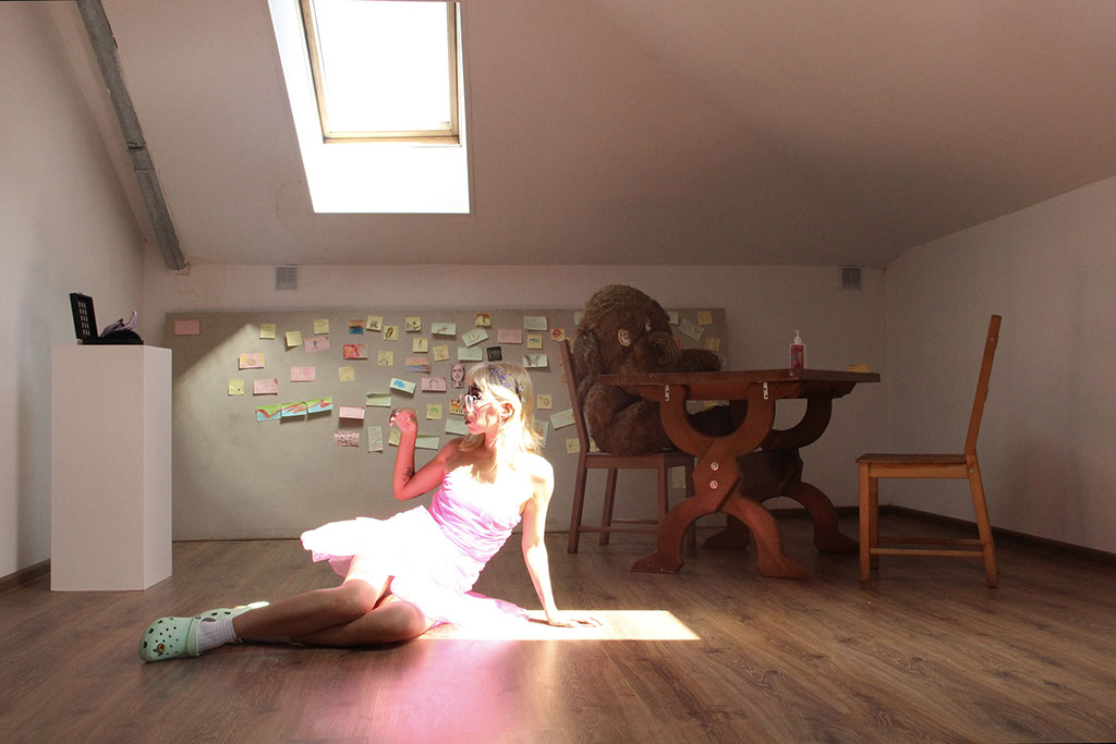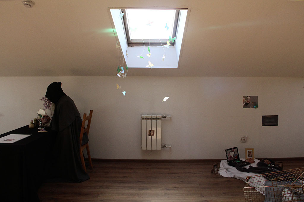 Вид на выставку c художницей Наташей Ангашановой в качестве модели съемки.