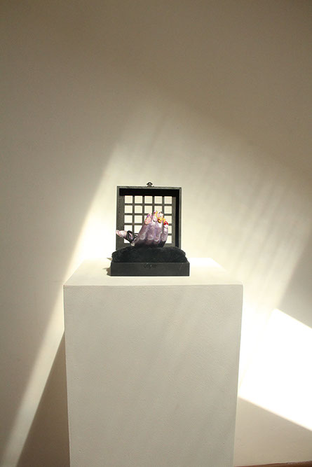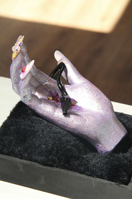 Материалы: слепок руки автора, акрил, лак с блестками, накладные ногти с маникюром Саши Будаевой (@budaevart), шкатулка, синтетическая ткань, погнутый ключ.