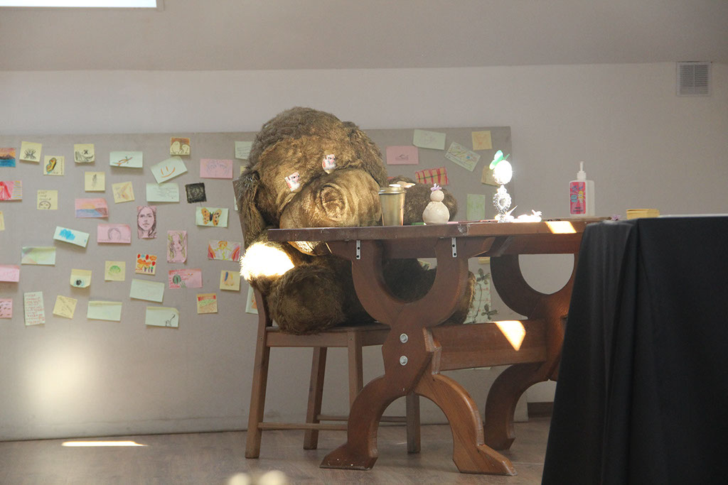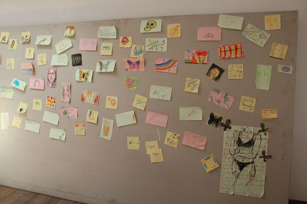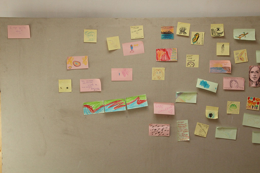 За столом для рисования посетителям выставки предлагалось нарисовать что угодно цветными мелками на стикерах и при желании приклеить на доску. Это можно было сделать в течение всей выставки.