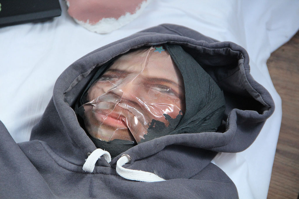 Материалы: 3D-маска А.С. Пушкина, наклеенная с искажениями на слепок лица автора; толстовка автора; найденные объекты.