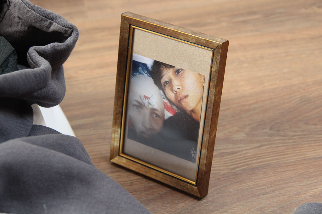 Материалы: слепок лица автора, раскрашенный под Джотаро Куджо из аниме «ДжоДжо», 3D-маска А.С. Пушкина, наклеенная с искажениями на слепок лица автора; толстовка автора; ноутбук с вырезанным сердцем на мониторе с коллажом «Рассвет в тишине среди росы» и стразы; селфи в рамках; найденные объекты; бумажные бабочки; печать.