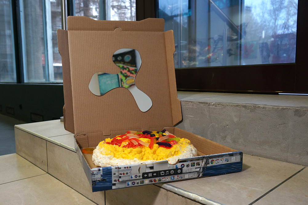 На видео четыре роботические руки наподобие тех, что используются в автомобилестроении как часть автоматизированного производственного процесса — собирают композицию из геометрических фигур. Эта композиция — один из "Проунов" художника-конструктивиста Эля Лисицкого. "Конвейерная площадка" размещена на красной матрице также внутри другой геометрической композиции Лисицкого — "Проун 99".