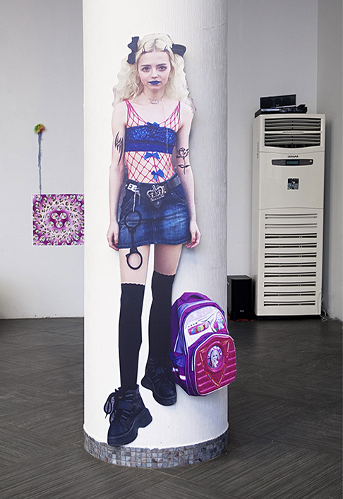 Бумага, гуашь, акрил, уголь, гелевая ручка, аэрозольная краска, стол — работа художницы Валентины Новиковой, изготовленный Вадимом Мелем стул, худи, джинсы, кроссовки, 3D-маска Александра Пушкина, бабочка из бумаги Caligo Memnon, фотопечать, найденные объекты, рисунок под лестницей.